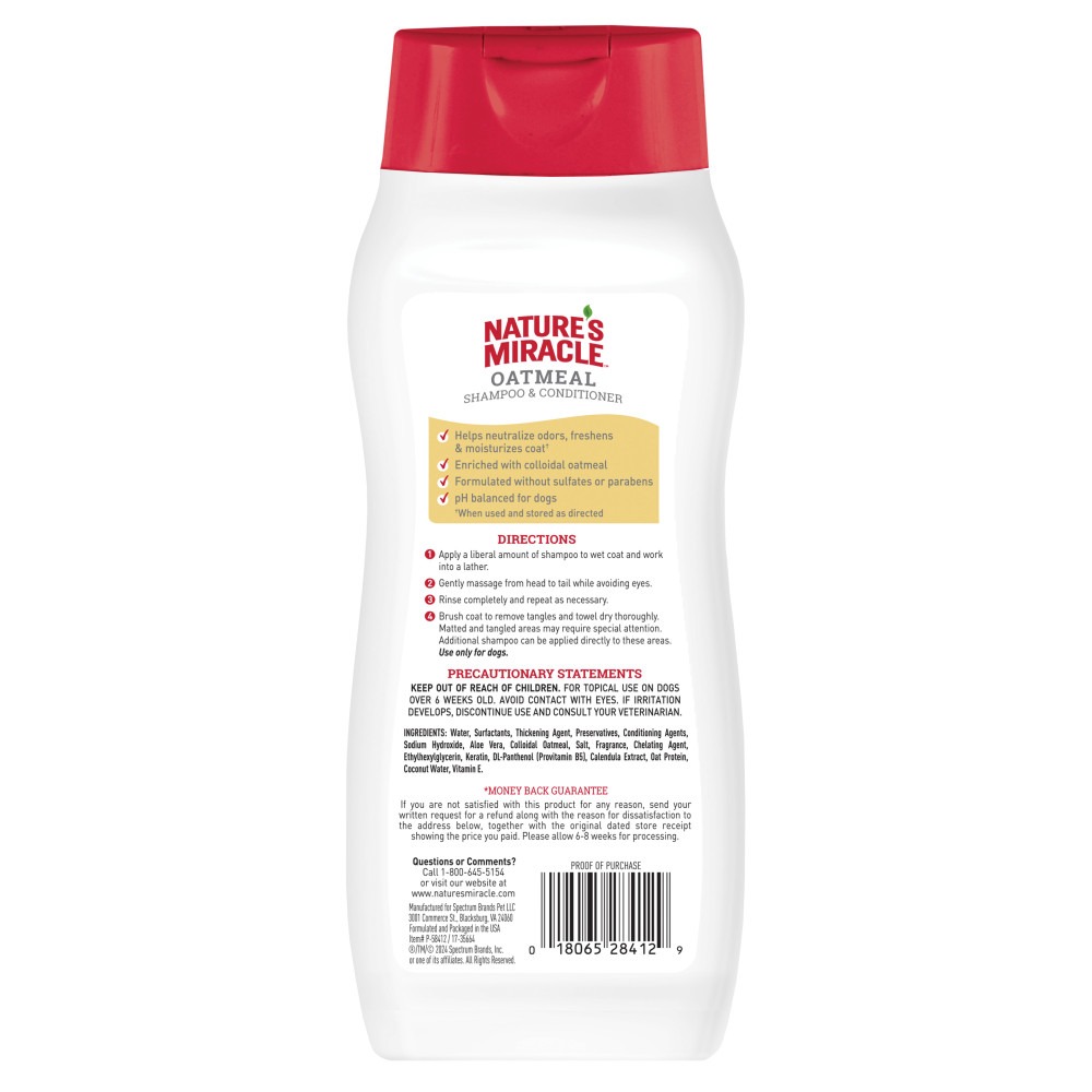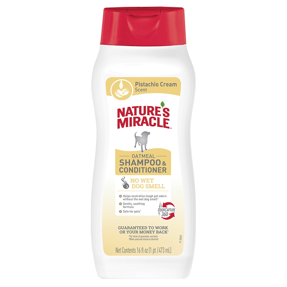 Шампунь-кондиціонер 8in1 Nature's Miracle — це засіб 2-в-1 для догляду за шерстю та шкірою собак. Його формула з колоїдами вівса, пантенолом та алое вера розроблена для ефективного очищення, нейтралізації запахів та заспокоєння подразненої шкіри, залишаючи приємний аромат вівсяного молока та фісташки.