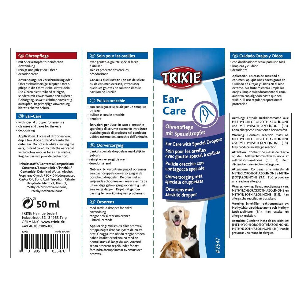 Засіб має спеціальну крапельницю-дозатор для зручного та точного нанесення. Його м'яка формула не подразнює чутливу шкіру вушної раковини, забезпечуючи делікатне очищення та профілактику захворювань, таких як отит.Переваги засобу для очищення вух Trixie: