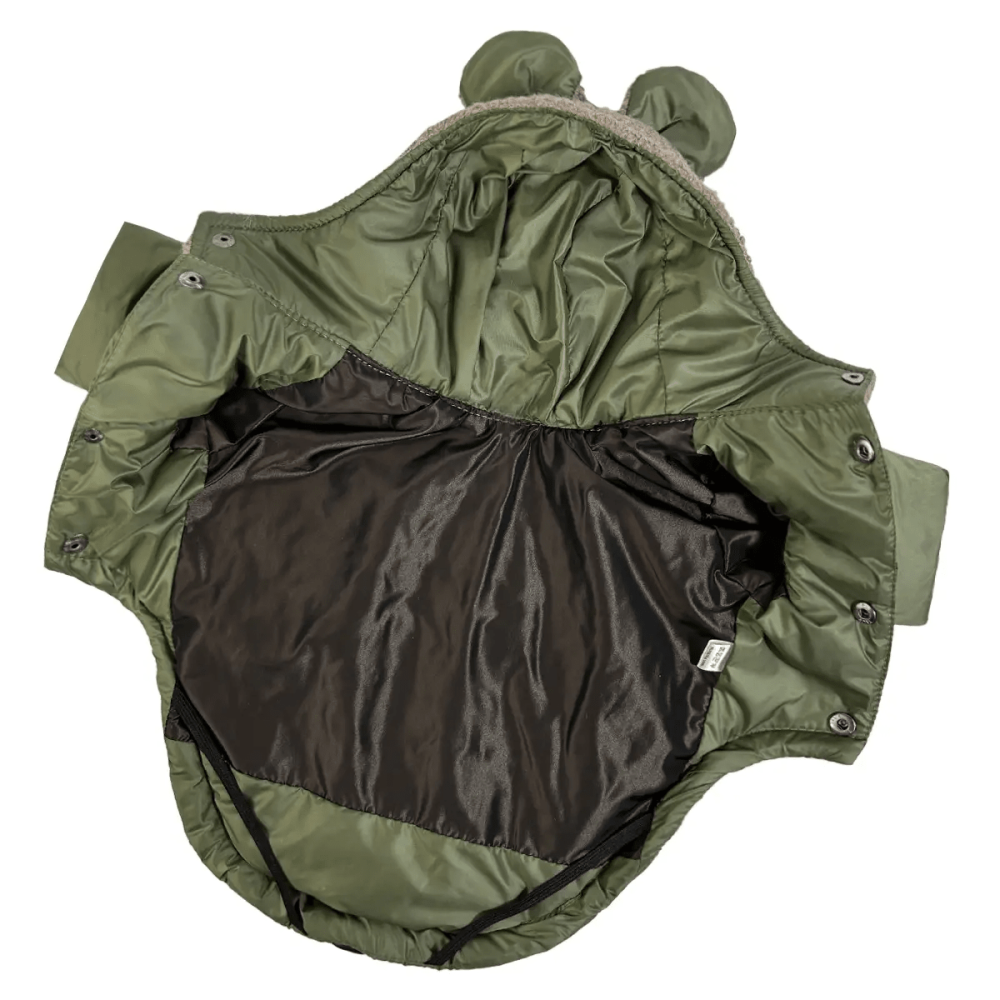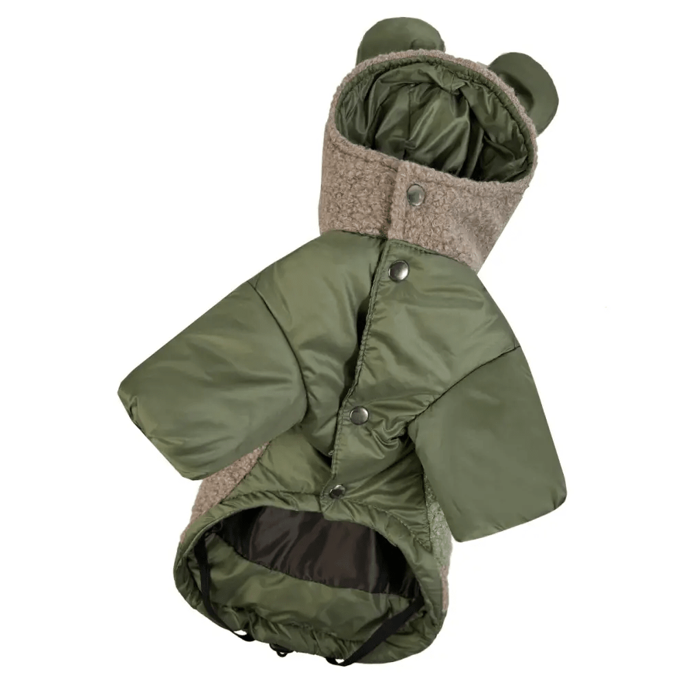 Підкладка з водовідштовхувальної тканини додає надійного захисту, тоді як регулювання довжини спинки дозволяє адаптувати посадку до індивідуальних потреб собаки. Отвір для повідця на шиї забезпечує зручність під час прогулянок, а капюшон із кнопкою-фіксатором захищає від вітру та може бути зафіксований для додаткового комфорту.