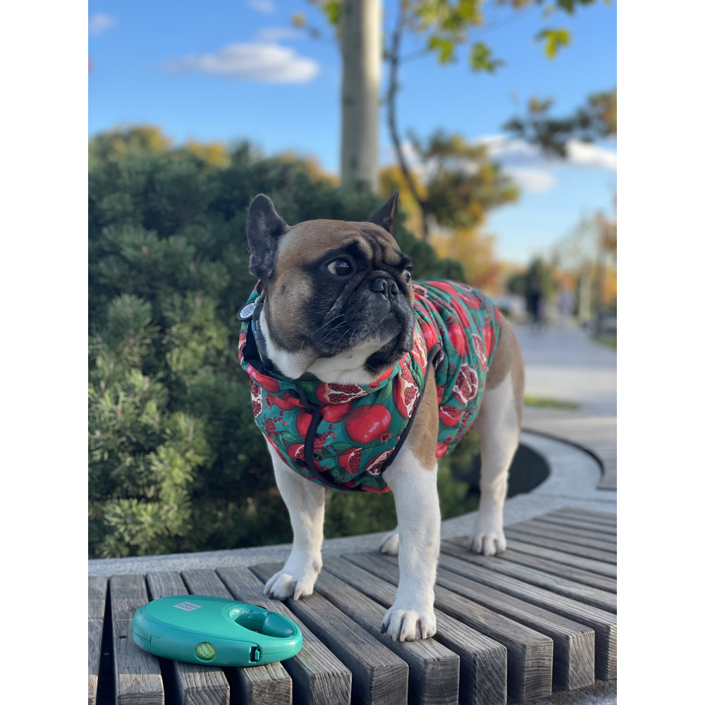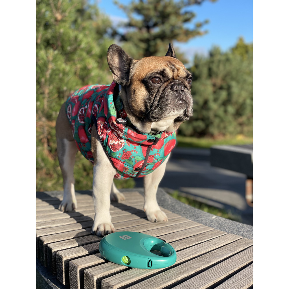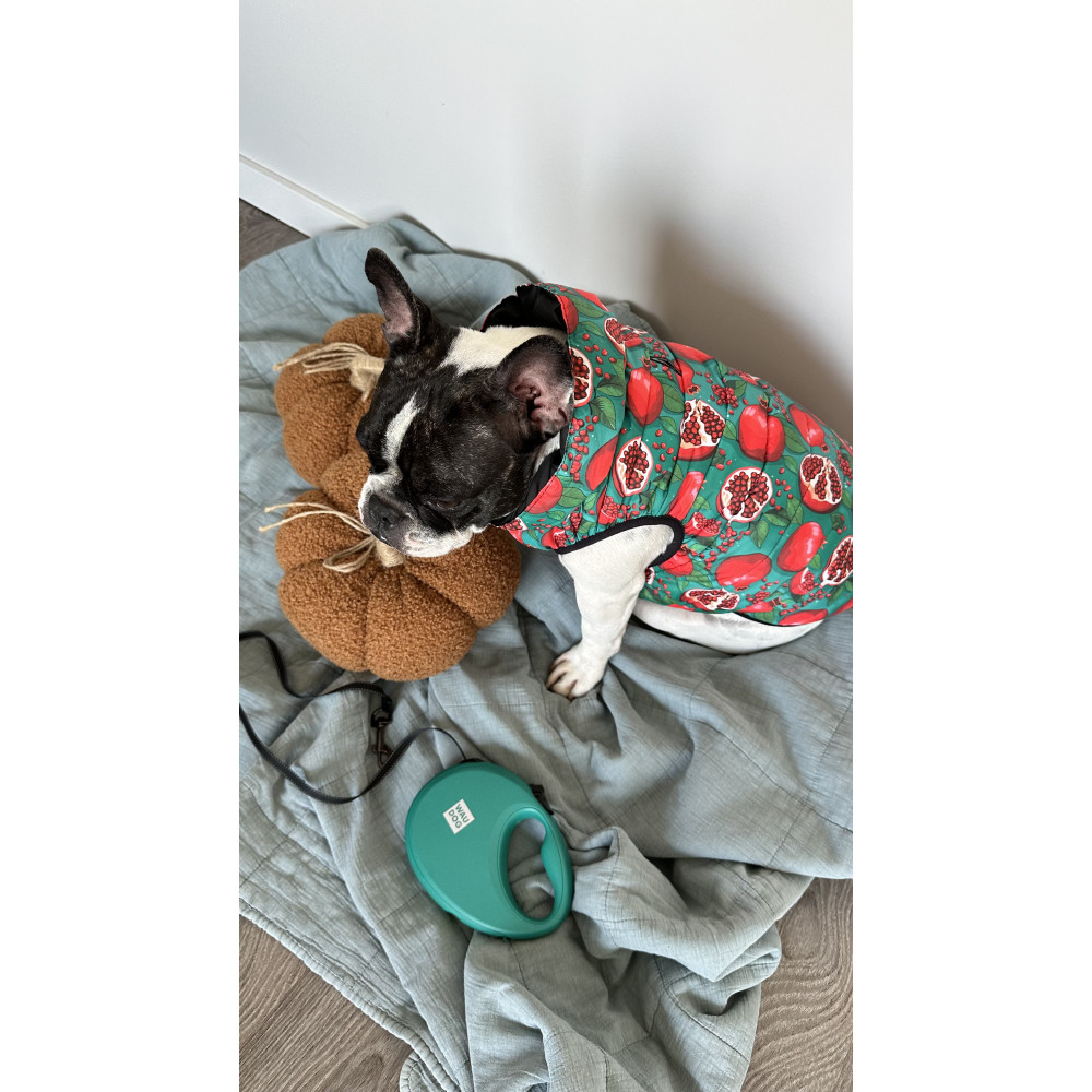 Завдяки подвійному ряду кнопок, курточку можна ідеально підлаштувати під розмір собаки, що забезпечує максимальний комфорт. Яскравий принт "Гранати" додає унікального вигляду, роблячи вашого собаку зіркою прогулянок.